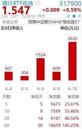 昨日银行再度大放异彩,涨幅居市场前列,主线不改。两市唯一的跨AH两市的银行ETF优选(517900)放量收涨0.59%,年内累计涨18.27%。交投活跃,换手率达14.54%全国排名前十配资公司,成交额约4000万,较前一日环比放量近100%。数据显示,截至6月10日,该基金获资金连续5日净流入,累计约5700万,规模份额双双再登历史新高。